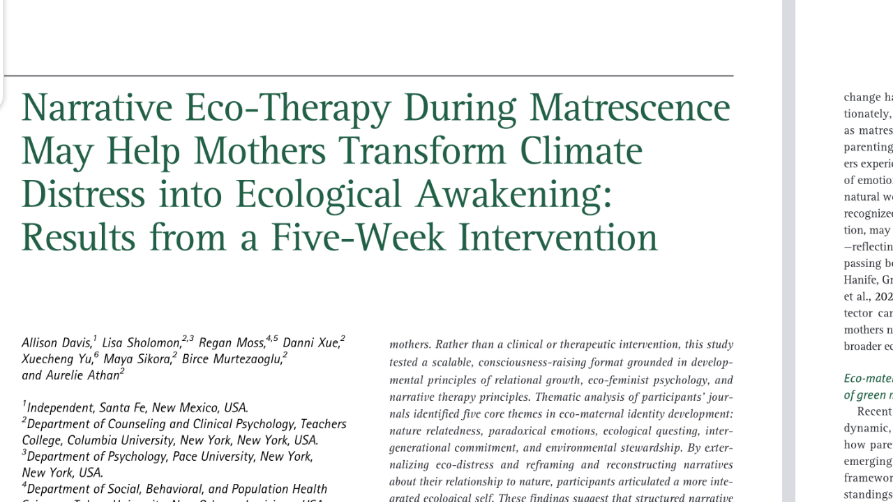 This pilot study explored how new mothers experiencing eco-distress during matrescence—the developmental transition into motherhood—might transform that distress into ecological awakening. Over five ...